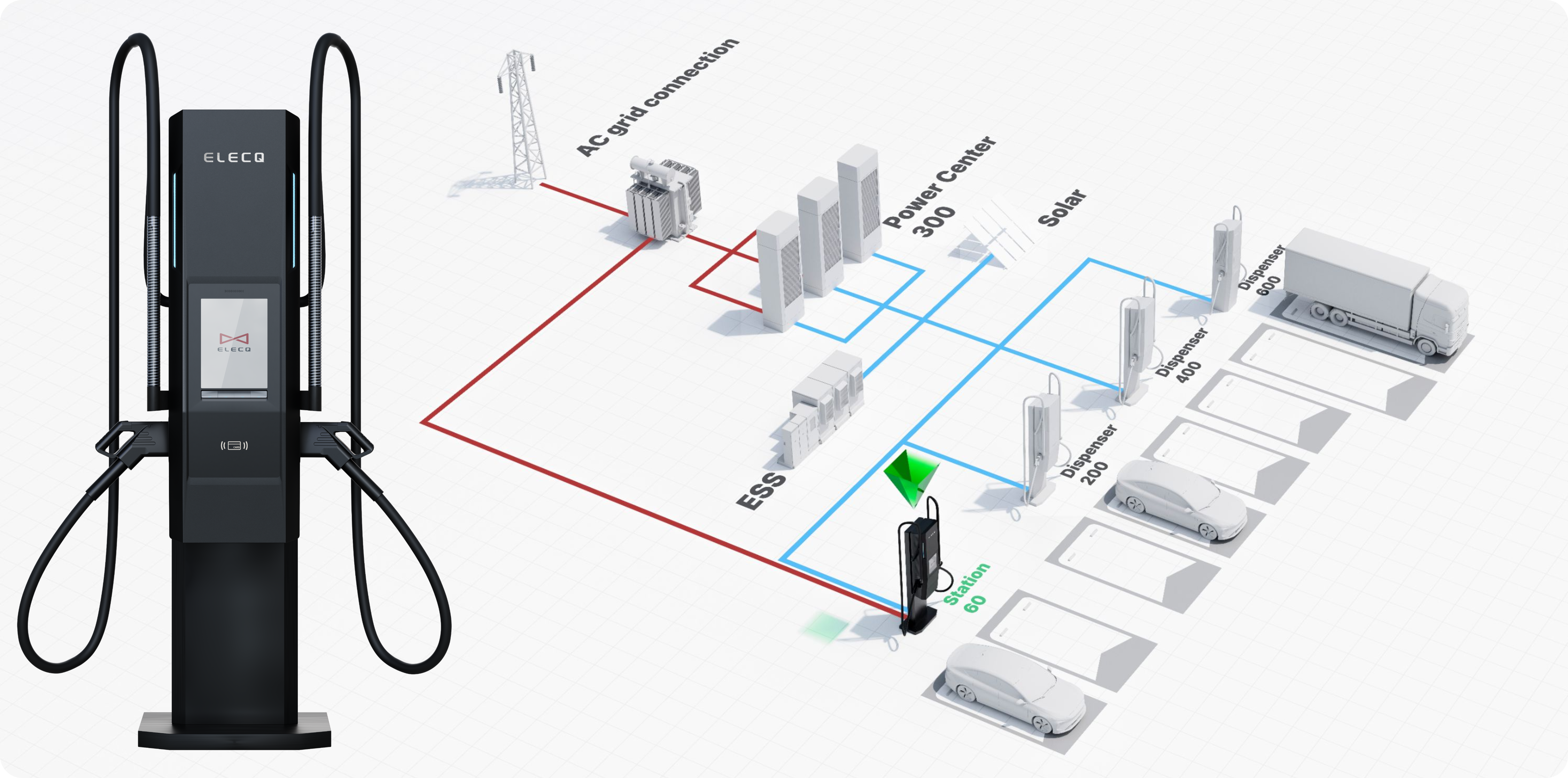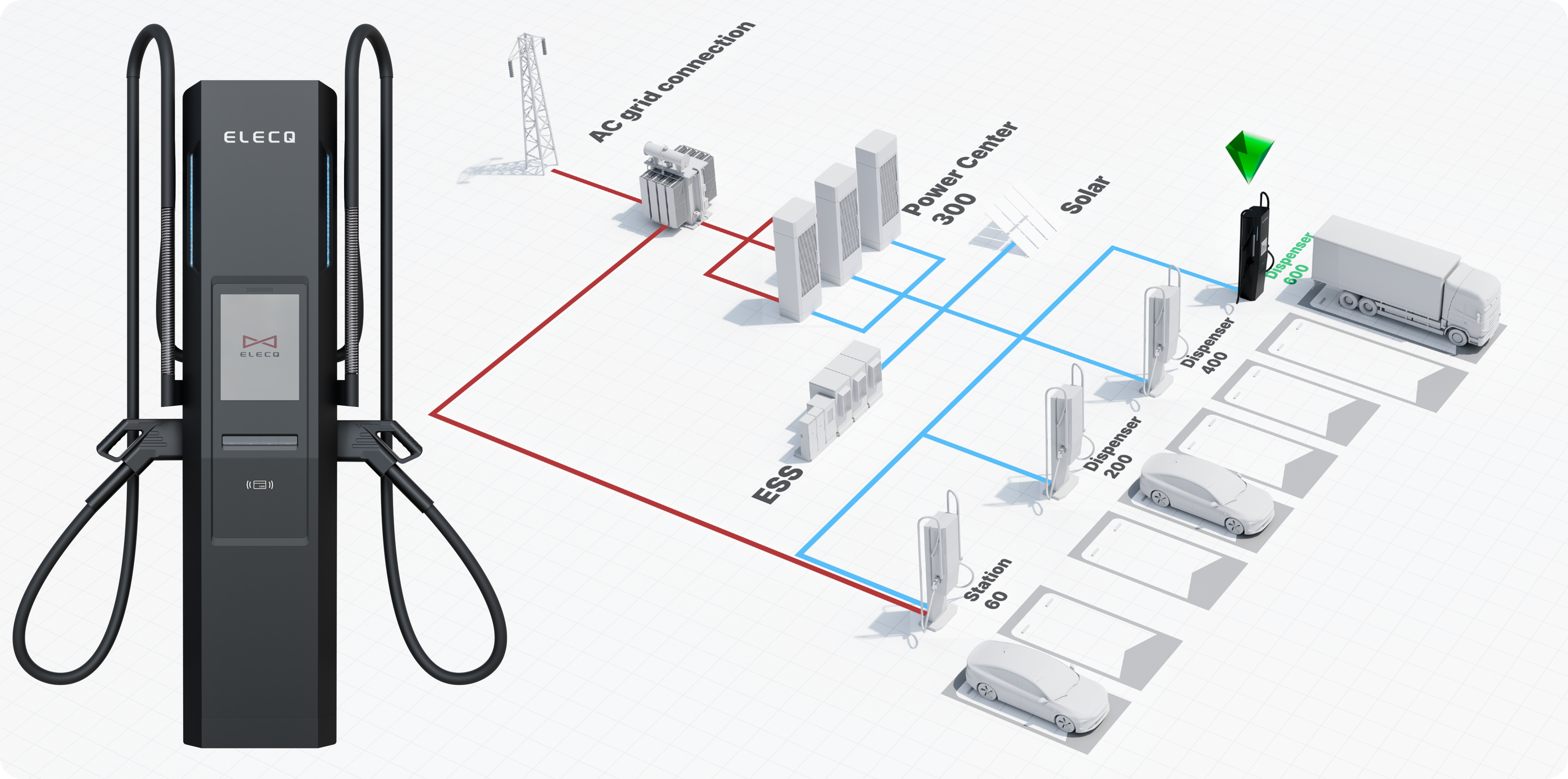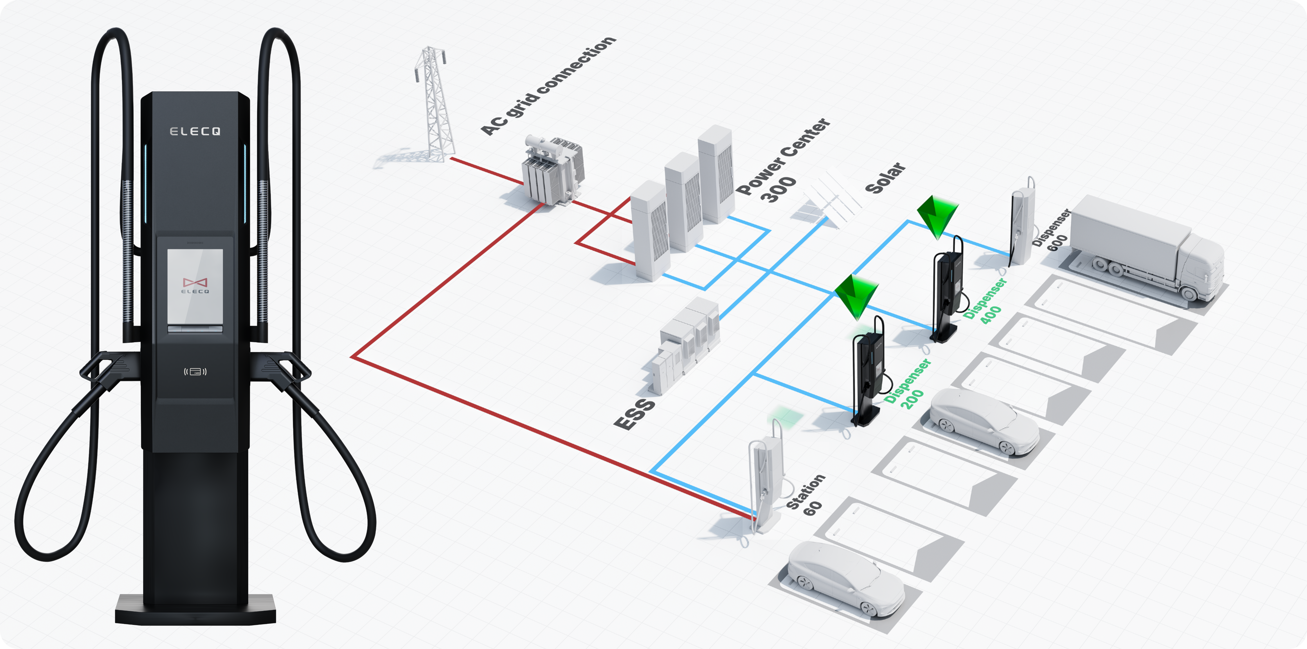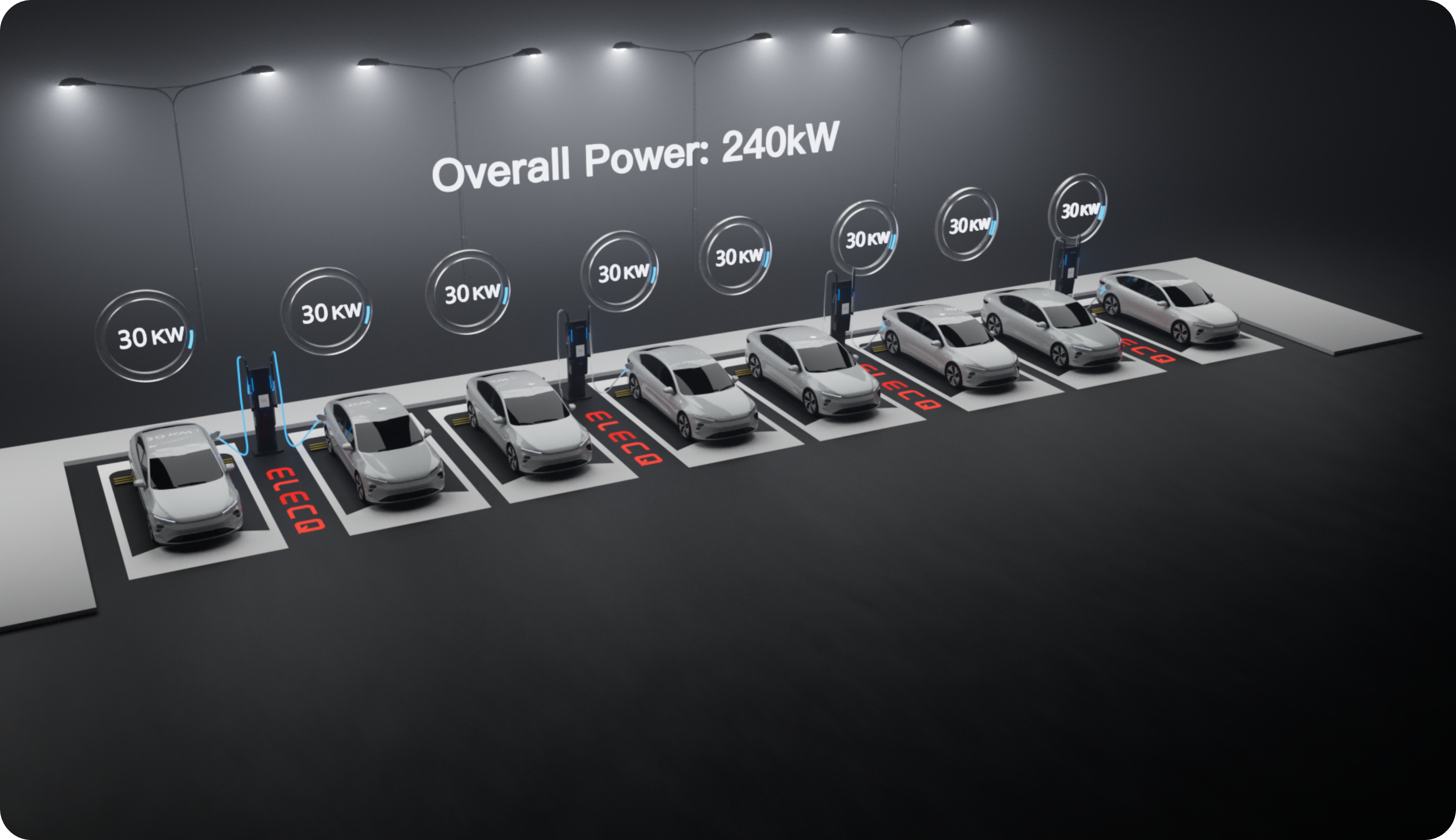 The Elecq DC series can dynamically allocate idle power to single or multiple outlets with zero granularity, significantly enhancing flexibility and enabling more effective energy distribution across vehicles.